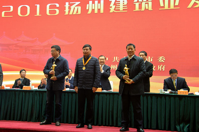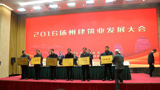 會議由聞道才副市長主持,與會人員首先觀看了“十二五”揚州建筑業發展專題片,聽取了朱民陽市長所做的工作報告。然后市政府對2015年全市建筑業目標管理獎獲獎單位和全市建筑業先進企業、先進個人進行了表彰。建工控股公司獲得唯一的2015年市政府建筑業目標管理一等獎,位列各縣(市)區之上,市委書記謝正義親自向陸金龍董事長頒獎。2015年全市僅有的兩項魯班獎工程均由江蘇華建創造,宗有農總經理、吳士茂主席上臺領獎。此外,江蘇華建還有4名員工分別被市政府表彰為優秀建造師、優秀班組長。